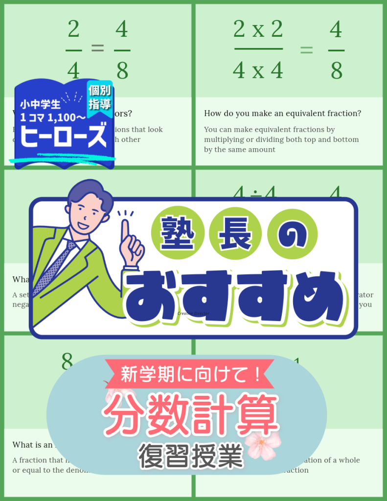 算数や数学が苦手な生徒にとって、分数は学習のターニングポイントといえます。分数の通分や約分でつまずくと、その先の方程式や関数といった重要な単元でも苦戦してしまうことがあります。これらは特に入試での出題率も高いため、しっかりと理解しておくことが重要です。分数を「難しい」と思わせずに、自信を持って解けるようにしておくことで、次に進む学びがよりスムーズになるでしょう。 算数や数学は、しっかりと基礎を復習すれば点数が上がりやすい科目です。春休みはその絶好の機会となるので、苦手を克服するチャンスです。ヒーローズの学び放題コースでは、中学生向けに9900円からの定額料金で何コマでも学習できる柔軟なカリキュラムを提供しており、特に分数などの苦手単元を集中して克服したい生徒さんにおすすめです。詳しい情報は、お気軽にLINEでお問い合わせください。
