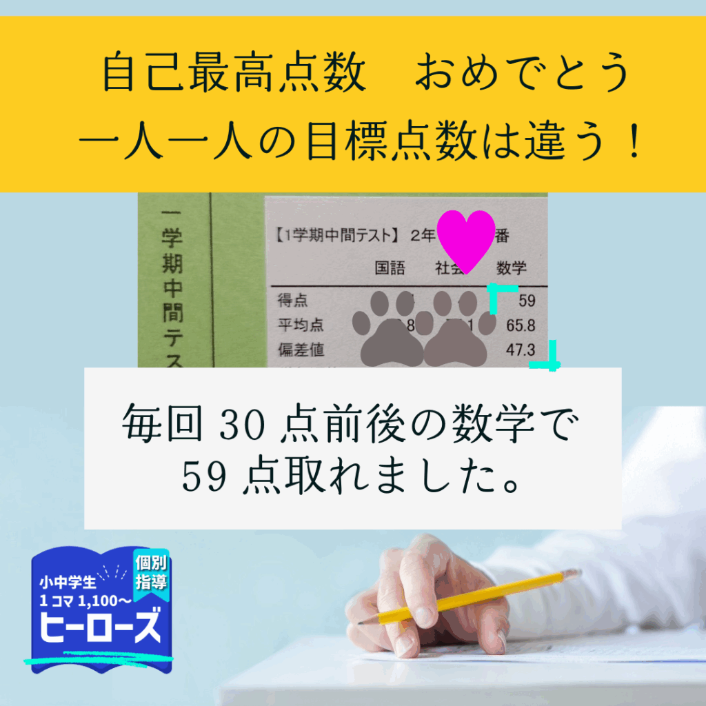 ヒーローズは、生徒一人一人の実力に合わせて指導をしています。全員が100点を目指すのではなく、それぞれの目標に合った学習法を提案します。春に入塾した中学2年生は数学が大の苦手で、毎回のテストでは30点前後が常でした。しかし、ヒーローズの学び放題コースで学習を進めたところ、6月の中間テストで自己最高記録の59点を獲得することに成功しました。この得点は平均点には達していませんが、生徒本人にとっては大変満足のいく成果です。 入塾当初は、中学1年生の基本的な内容も理解できない状態でしたが、多くの基本問題を何度も繰り返し取り組み、テスト範囲も徹底的に復習しました。テスト後には、自信を持てるようになり、2年生の内容の予習を始めています。連立方程式や一次関数の理解も徐々に深まっています。 ヒーローズは、どの生徒も自分の到達可能な目標を設定し、それをクリアしたらさらに上を目指す学習方法で成績アップを目指しています。